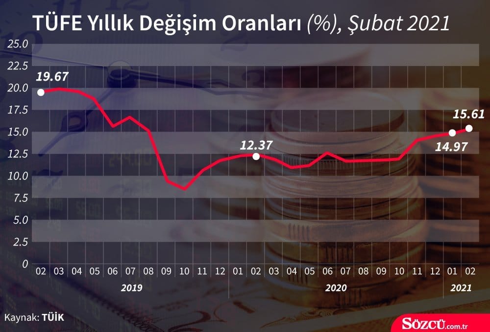 TÜİK’in bugün açıkladığı son verilere göre tüketici fiyat endeksi (TÜFE) yıllık yüzde 15.61, aylık yüzde 0.91 ile beklentilerin üzerinde arttı. Yıllık enflasyon 2019 yılının Temmuz ayından bu yana en yüksek değeri aldı. Şubat 2021’de, endekste kapsanan 415 maddeden, 263 maddenin ortalama fiyatında artış gerçekleşti.
